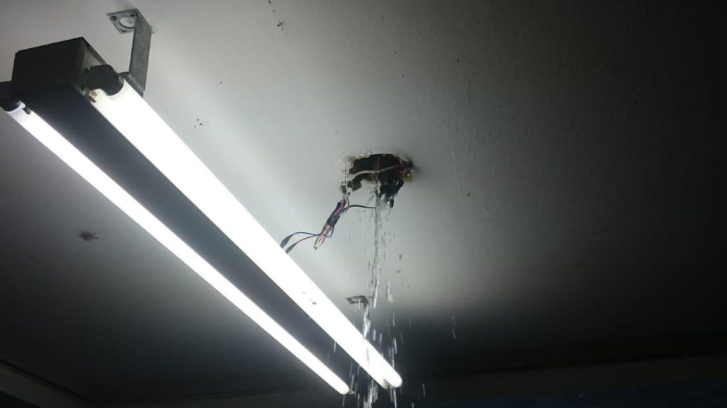 Água da chuva passando por dutos de eletricidade no CFM: a um passo de um incêndio.